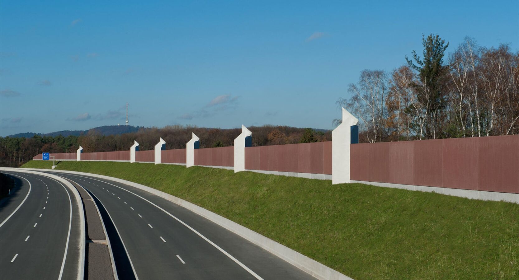 Einseitig hochabsorbierende Lärmschutzwand mit eingefärbter Schallschutzschicht