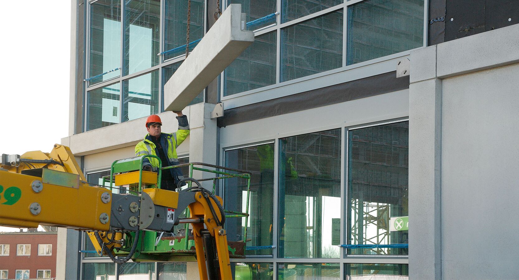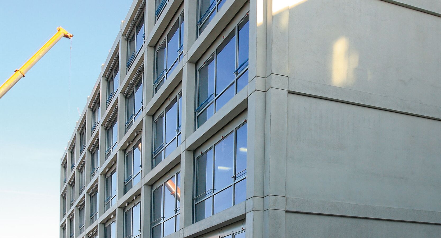 Hauptverwaltung mit vorgehängter bzw. gestapelter Stahlbetonfertigteilfassade.