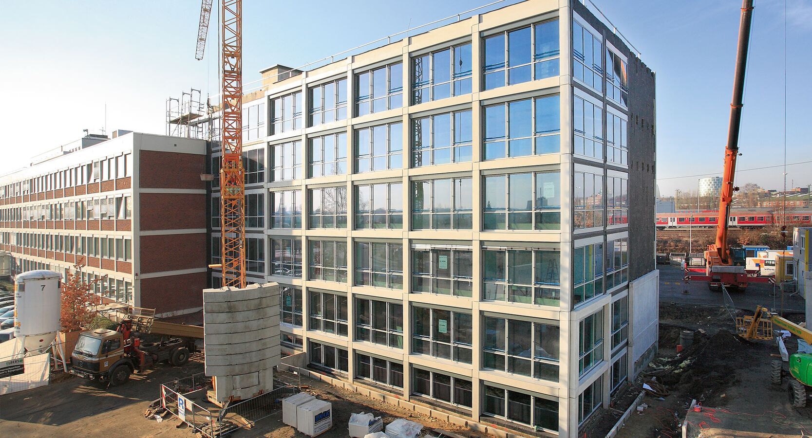 Die Fassade musste sich am Altbestand (Lisenen-/Riegelkonstruktion) orientieren. Der neue Verwaltungsanbau sollte die moderne Architktur zeigen, sich aber auch in dem Bestand widerspiegeln.
