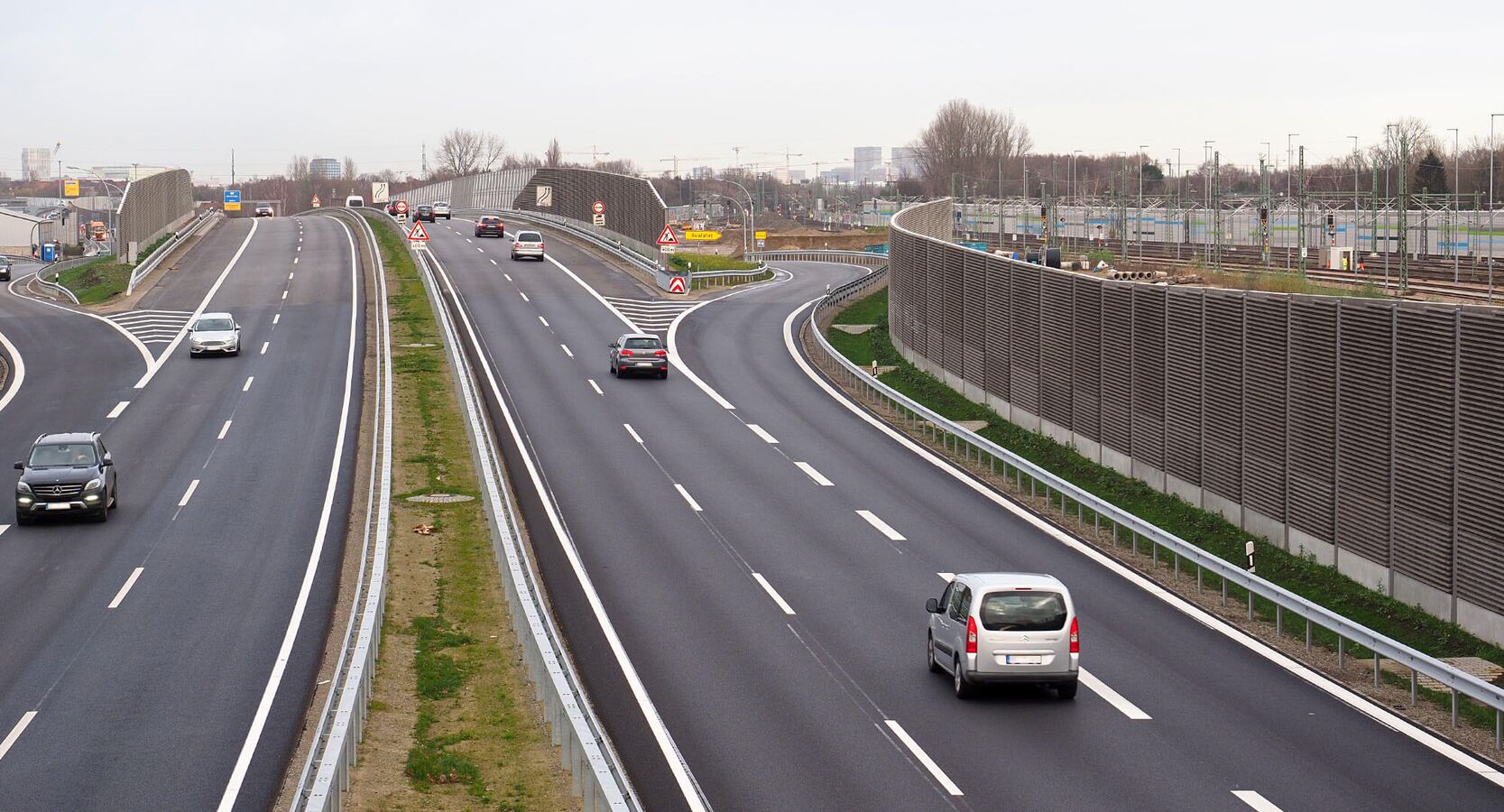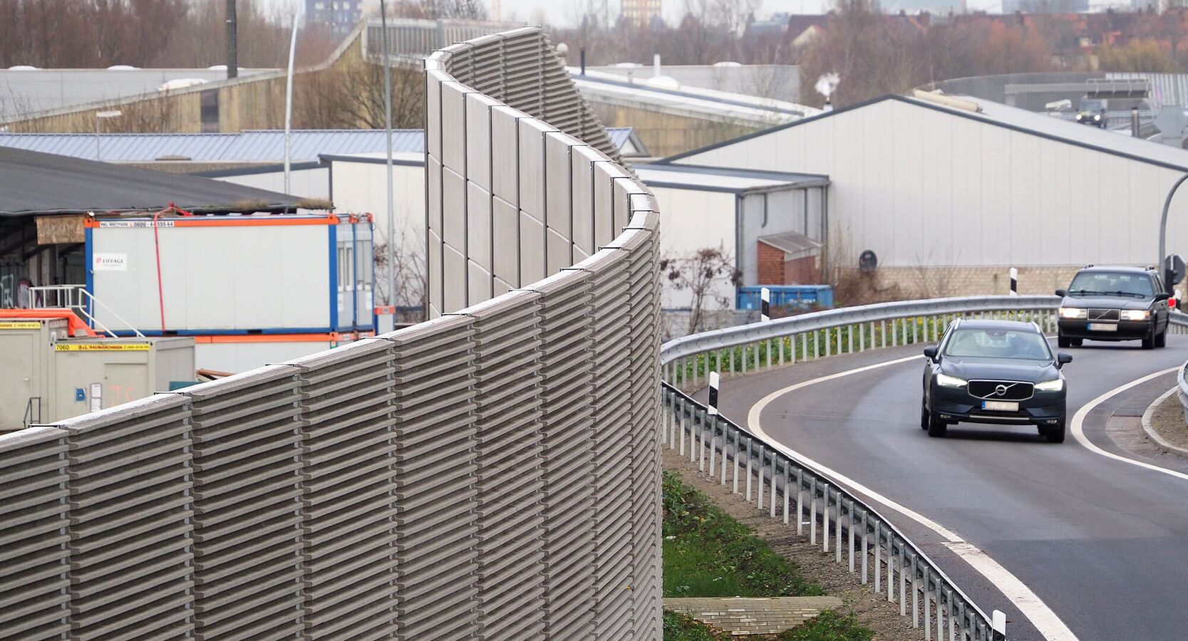 Neubau einer Lärmschutzwand an der neuen Wilhelmsburger Reichsstraße: Da die Schallschutzwand der Straßengradiente folgt, bleibt die Oberkante der Wand ohne abrupte Sprünge. Das ist nur möglich, da die Stahlstützen der Straßenneigung folgen. Das bedeutet, dass jede Stütze um wenige berechnete Grad vom Lot abweichend eingebaut wurde.