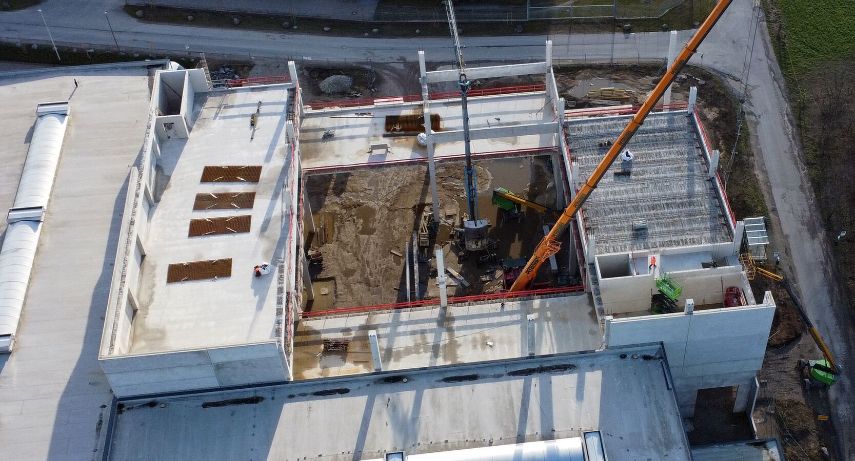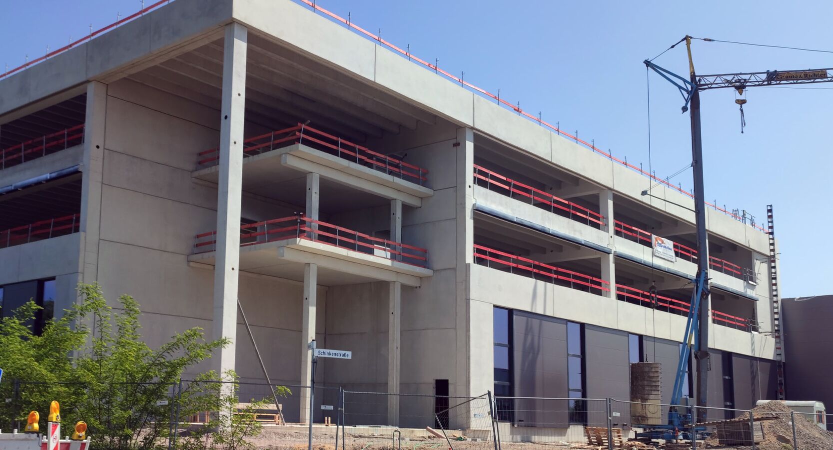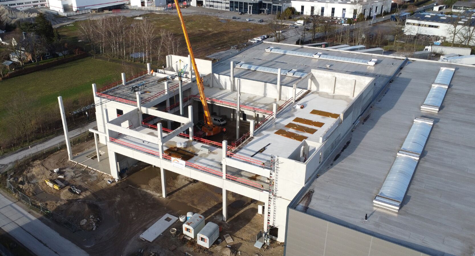 Errichtung einer 18 Meter hohen Produktions- u. Lagerhalle mit Verwaltung. Die Deckenelemente wurden auf Grund der hohen Verkehrslast mit »π-Platten« realisiert. Insgesamt sind 425 Betonfertigteile zum Einsatz gekommen.