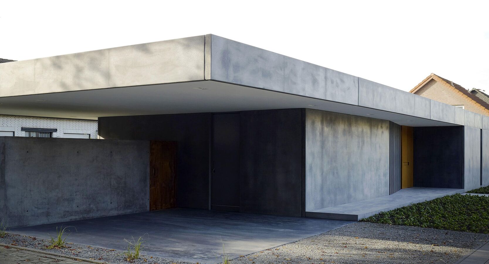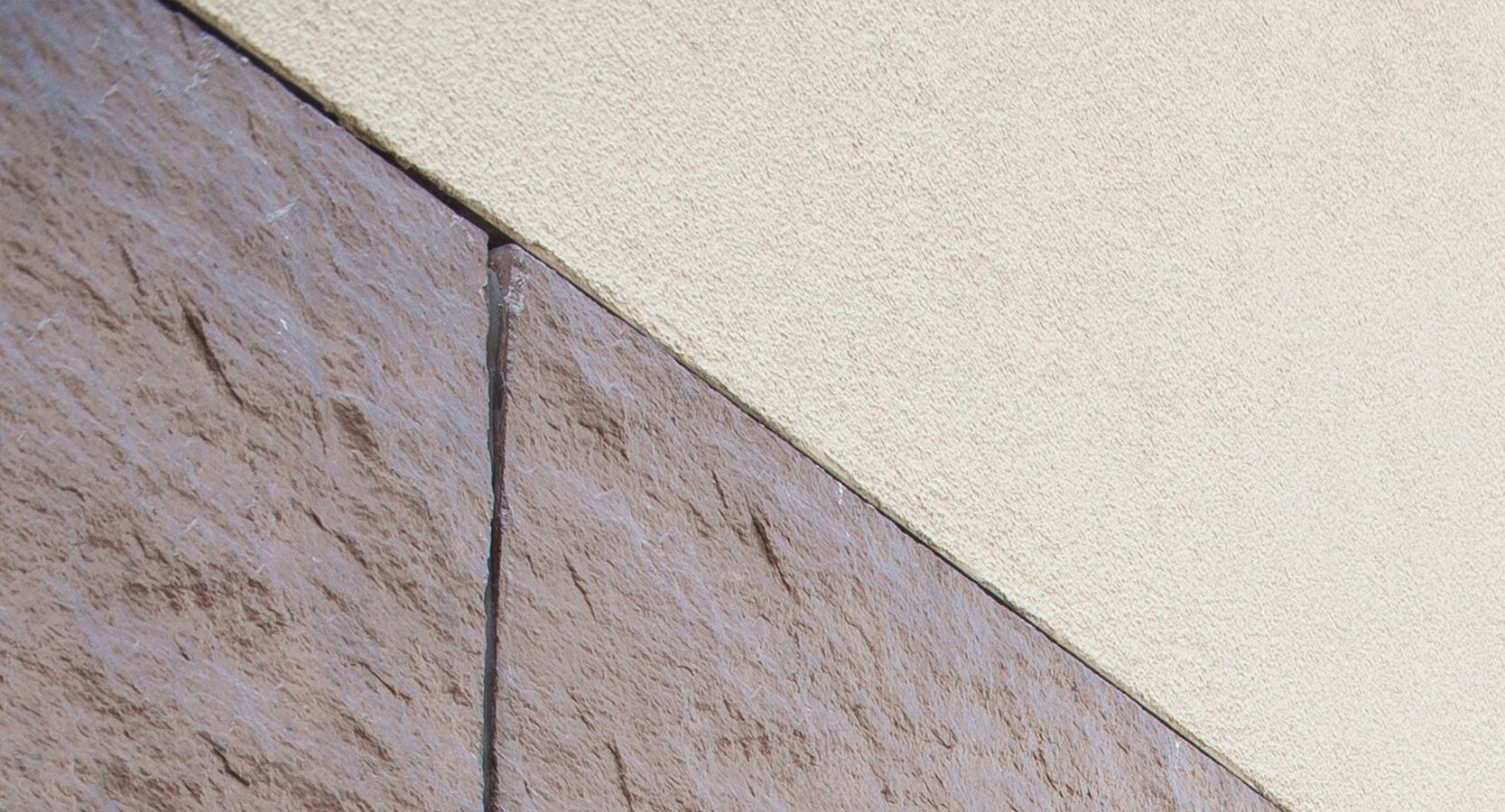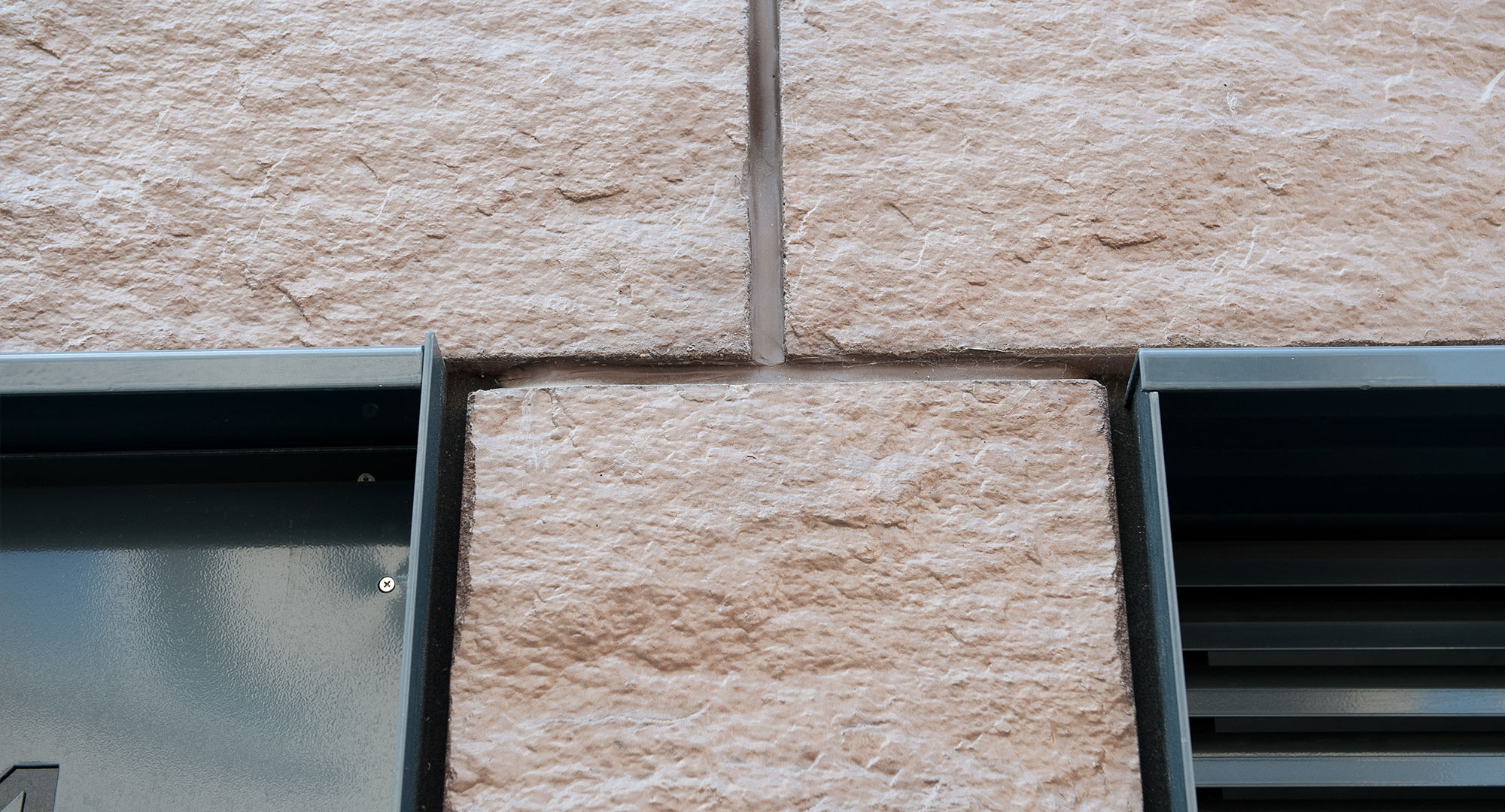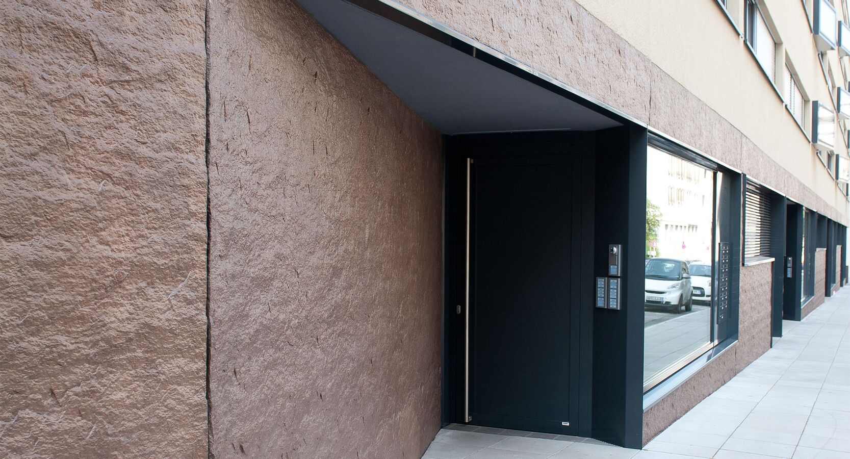 Wohn- und Geschäftshaus, vorgehängte Fassadenplatten mit Strukturmatrize, braun-rot eingefärbt