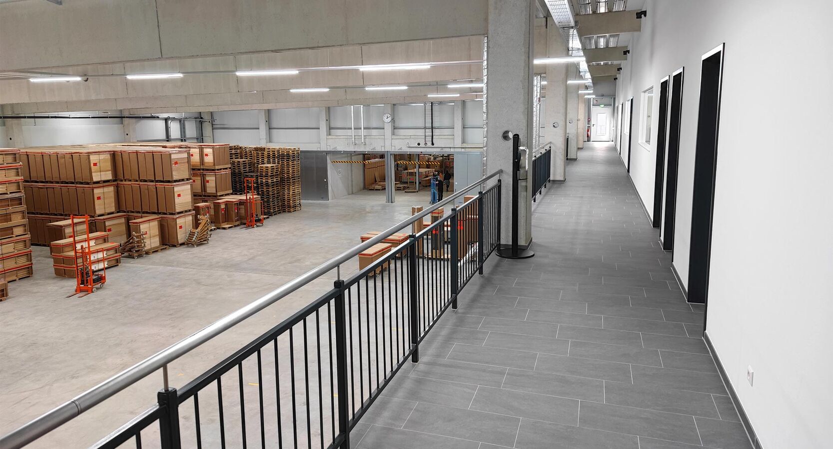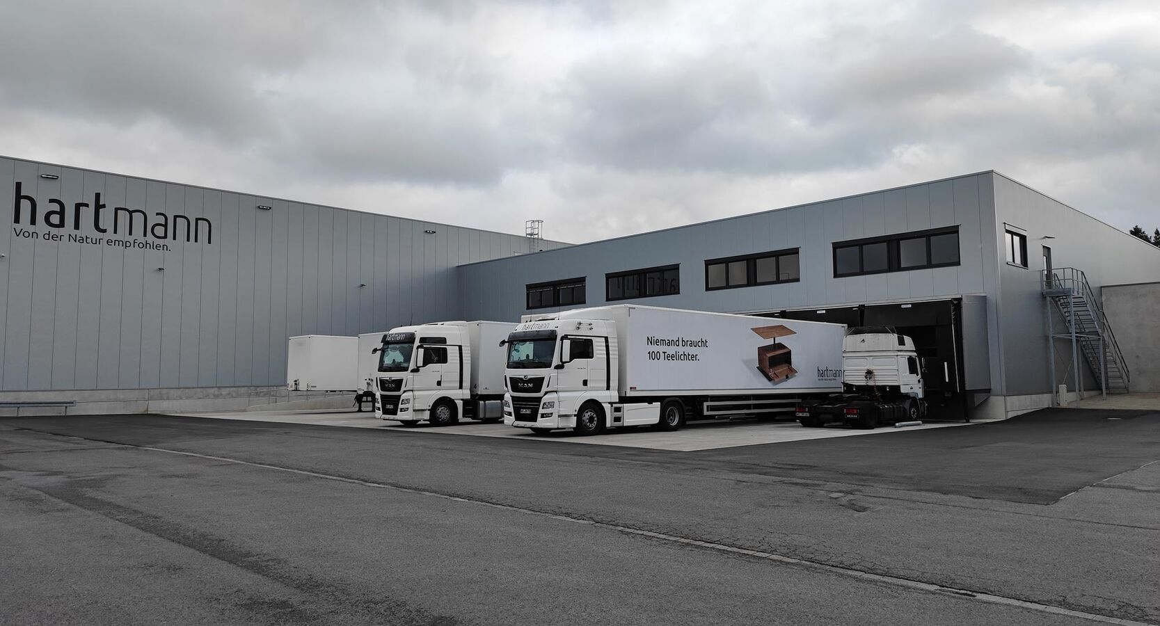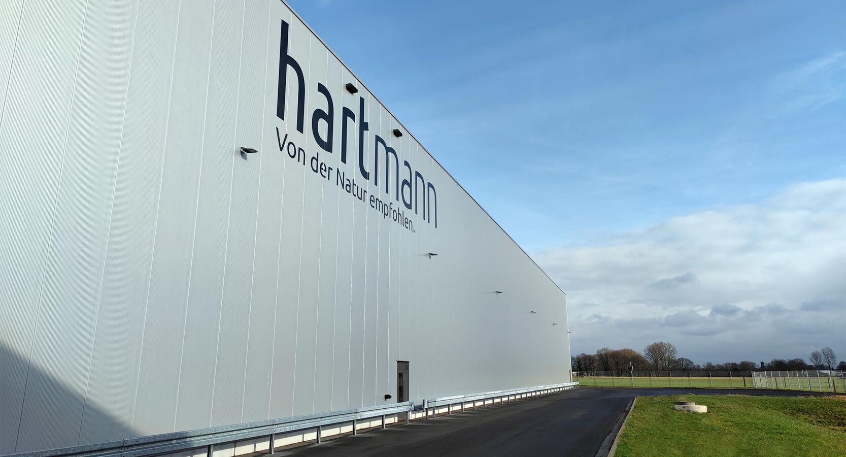 Schlüsselfertige Erweiterung einer 9.555 m² große Versand- und Lagerhalle inkl. 260 m² Büro-Ebene für Hartmann Möbelwerke. Es sind 368 Betonfertigteile, bestehend aus Stützen, Bindern, Balken, Sockeln und Wandelementen, verbaut.