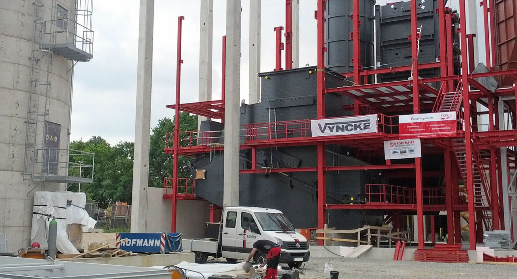 Die gesamte Konstruktion inkl. der Fassade besteht aus Stahlbetonfertigteilen. Im Heizhaus/Gebäude sind zusätzlich schwingungsarme Zwischendecken mit extrem hohen Ebenheits-Anforderungen sowie extrem hohen Punktlasten der Maschinentechnik erstellt worden.