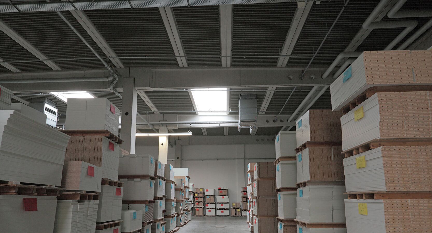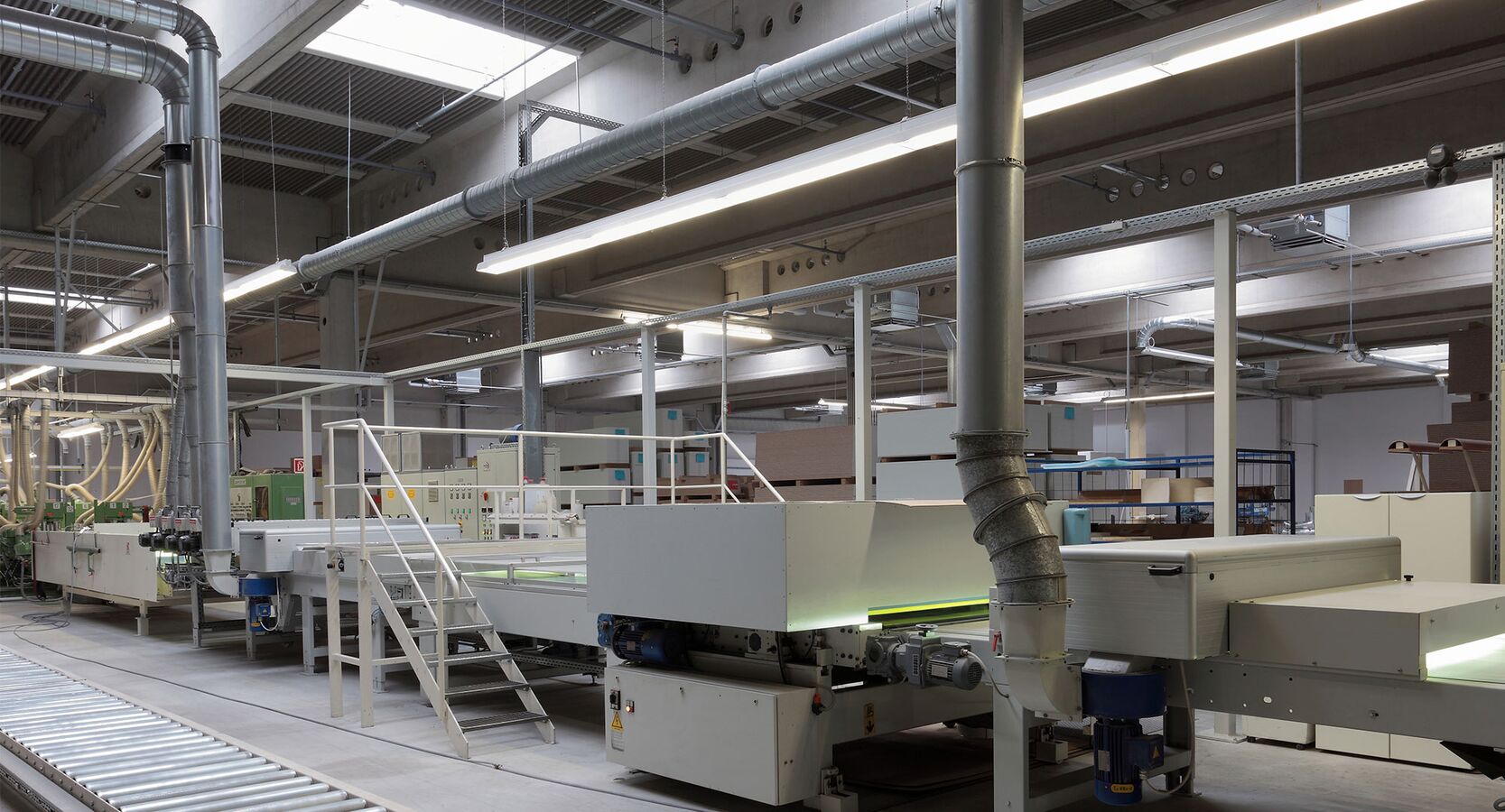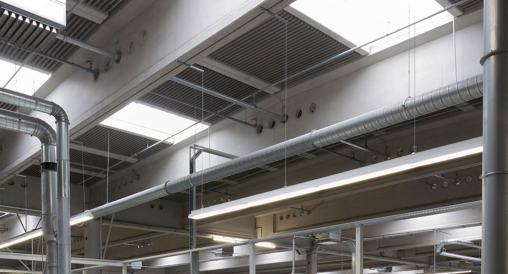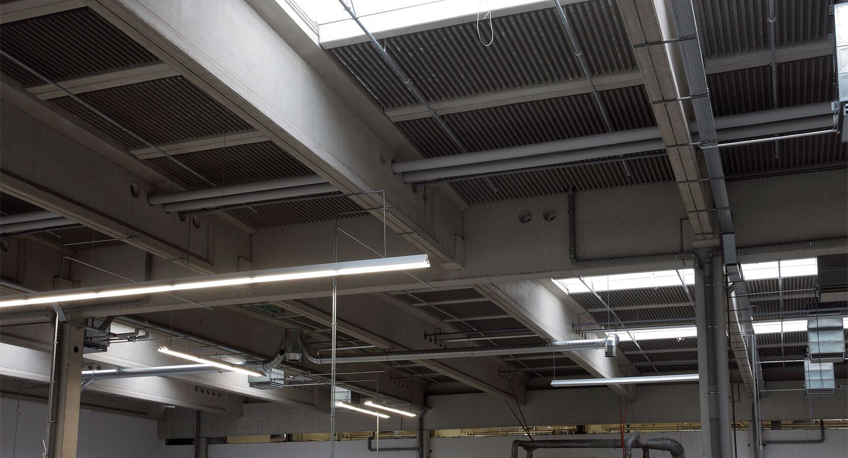 Produktionshalle mit einer schallabsorbierenden Stahlbetonfertigteil-Dachdecke (Lärmschutz). Die hochfrequenten Maschinengeräusche werden um ca. 50% absorbiert.
