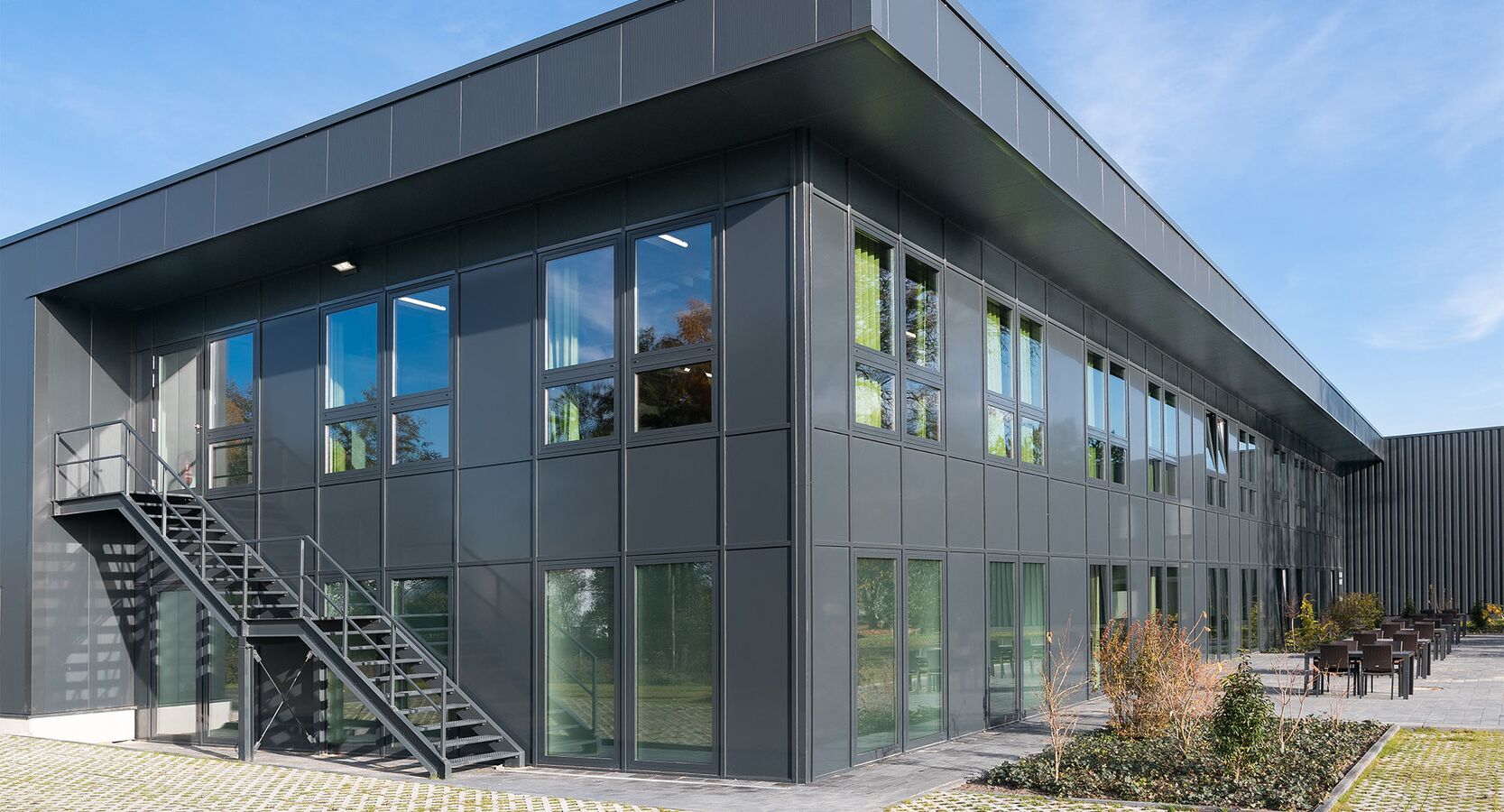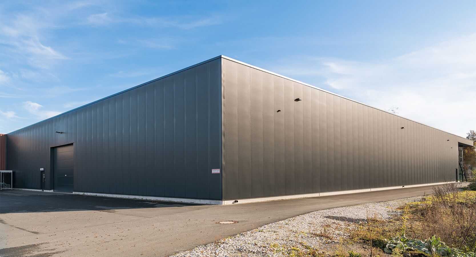 Schlüsselfertige Betriebserweiterung als Stahlbetonfertigteilkonstruktion für eine Lagerhalle mit 2-geschossigem Einbau für die Mensa, Sozialbereich und Vertrieb. Architektonisch gestaltete Pfosten-/Riegelkonstruktion und Fluchttreppe.