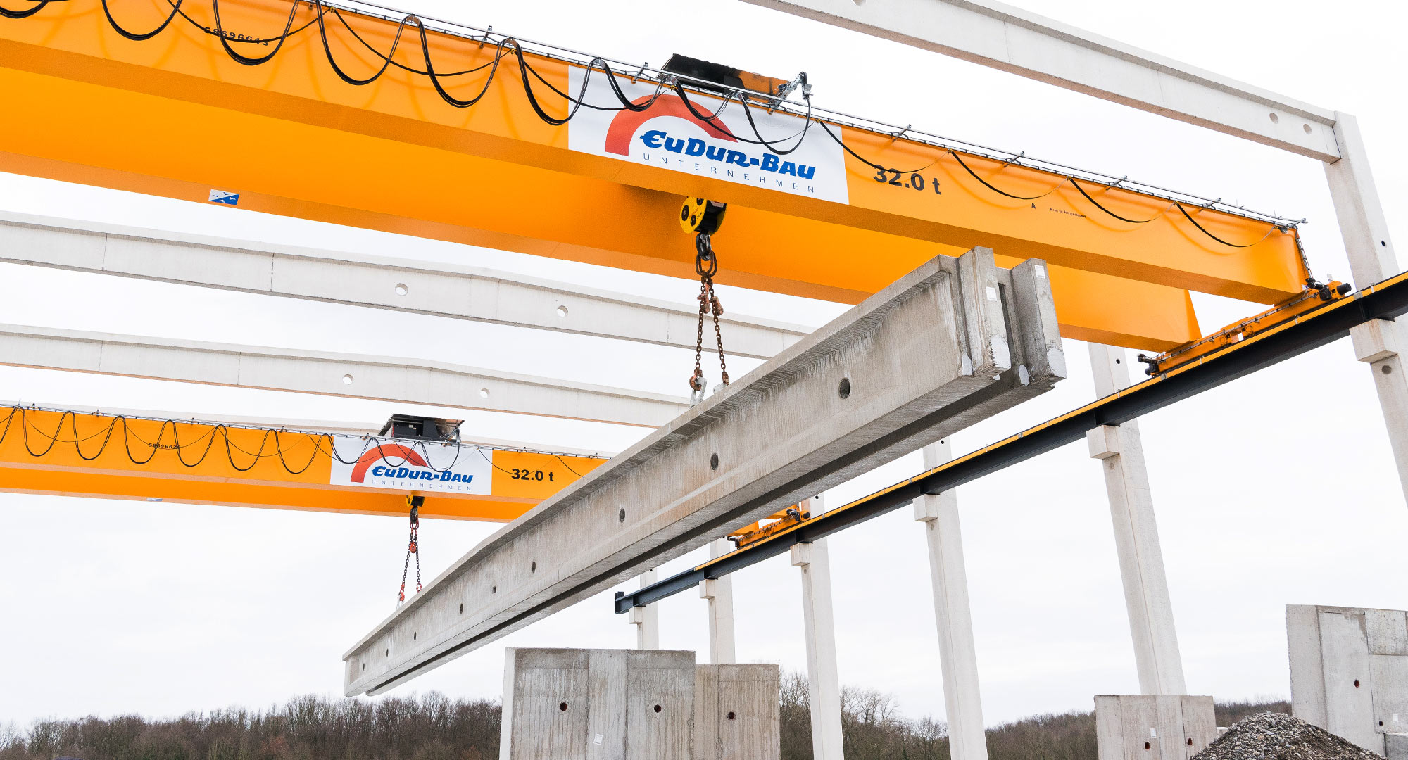 Produktion und Montage der Betonfertigteilkonstruktion einer Logistikhalle in Herzebrock. Besonderheit: Im Januar 2021 verließen die ersten eigens im Werk Herzebrock hergestellten Spannbetonbinder in Richtung Tennis-Point.