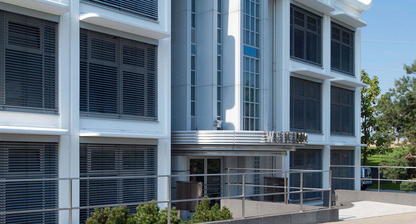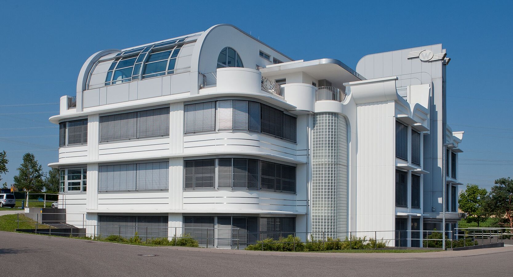 Ausgeführt mit weiß eingefärbten Stahlbetonfassadenplatten.