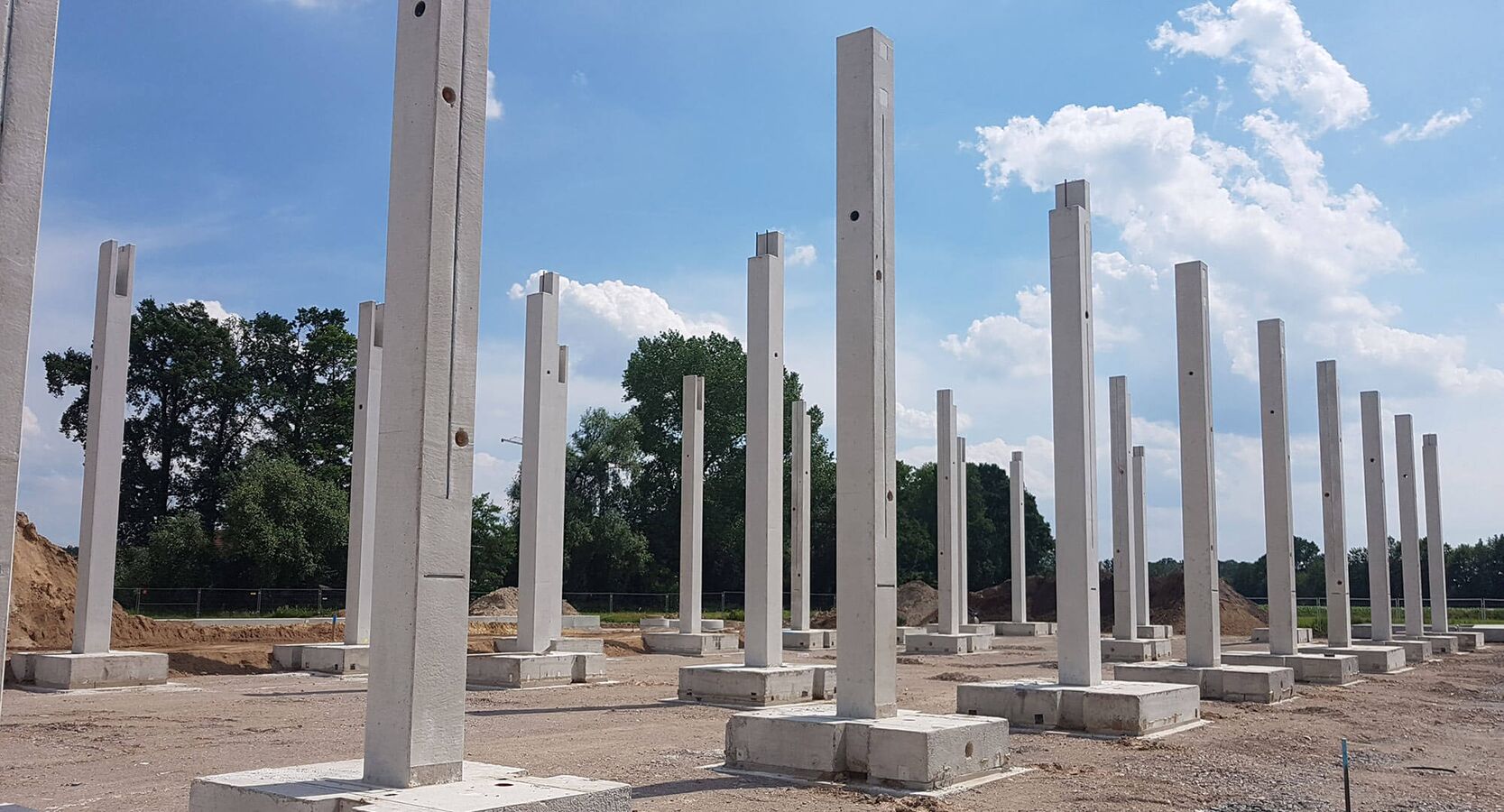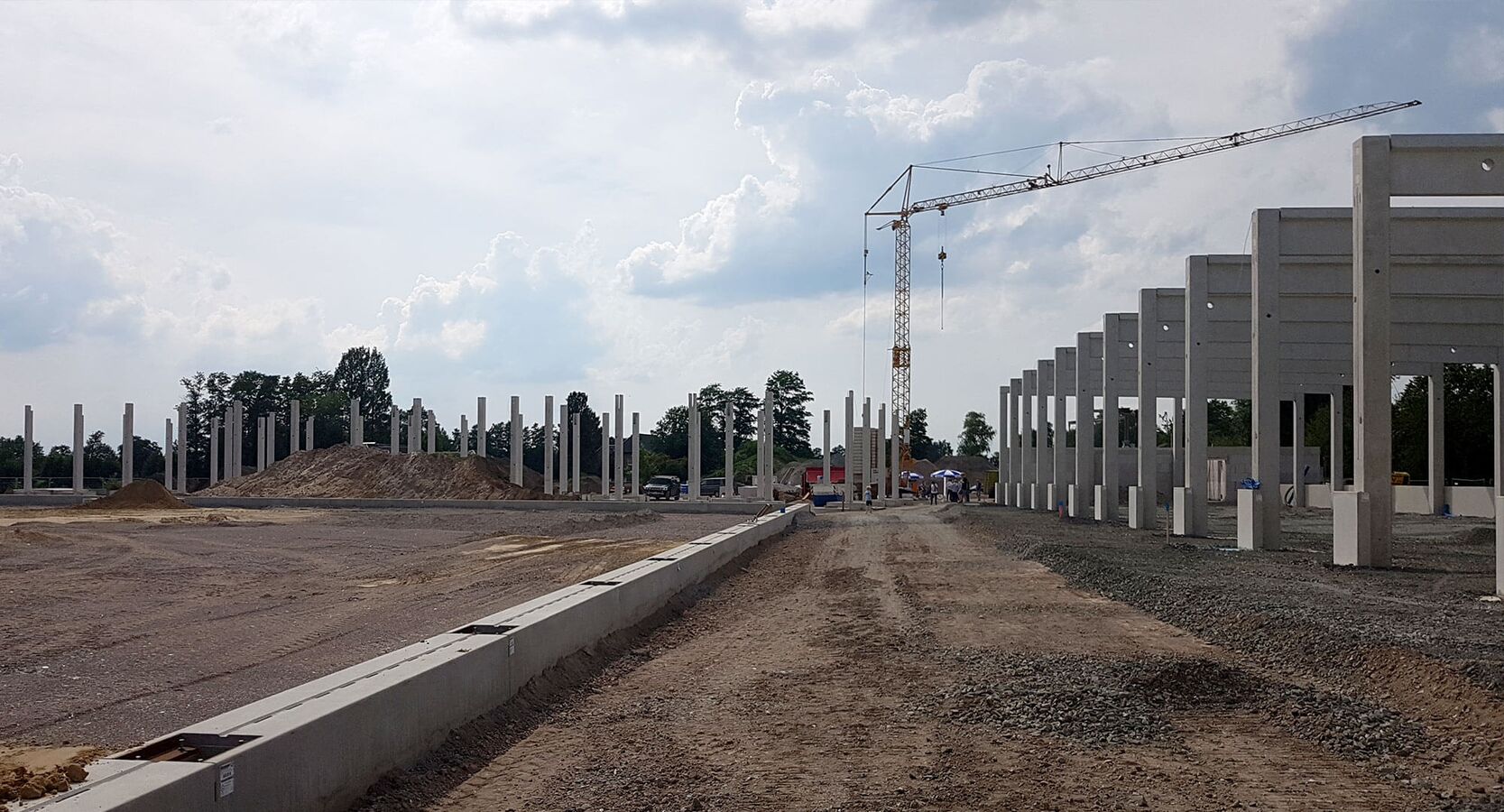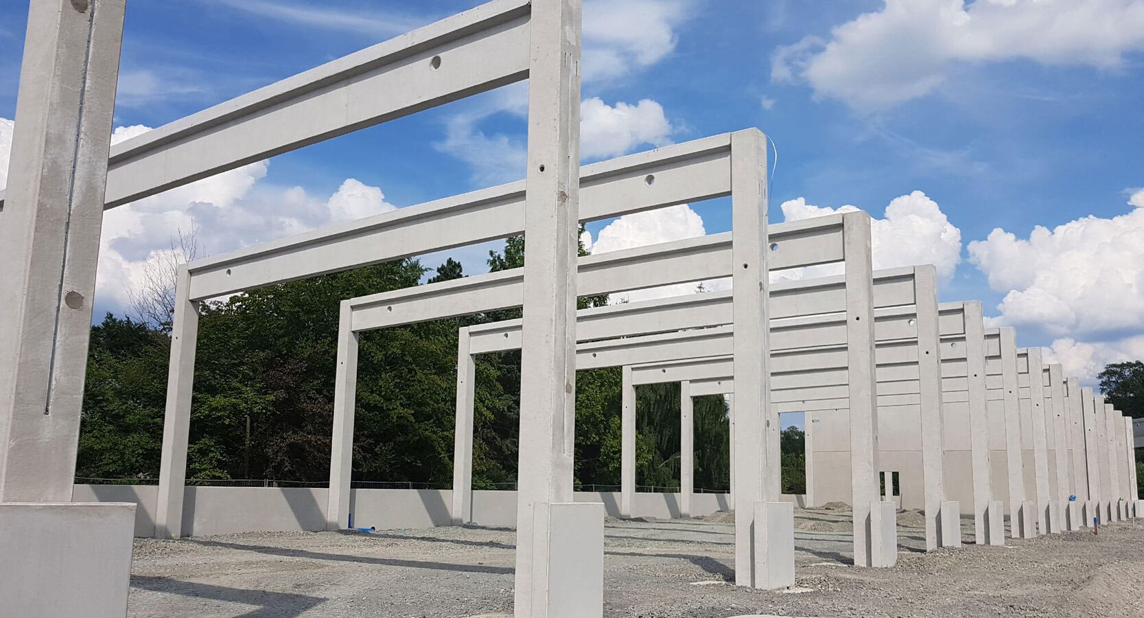 Gebäudekomplex mit Verwaltungs- und Sozialgebäude (515 m²), Halle für Fahrzeuge und Geräte und (1950 m²) sowie Werkstatt- und Waschhalle (1000 m²). Es sind 242 Bauteile bestehend aus Stützen, Bindern, Balken, Sockeln und Wandplatten verbaut.